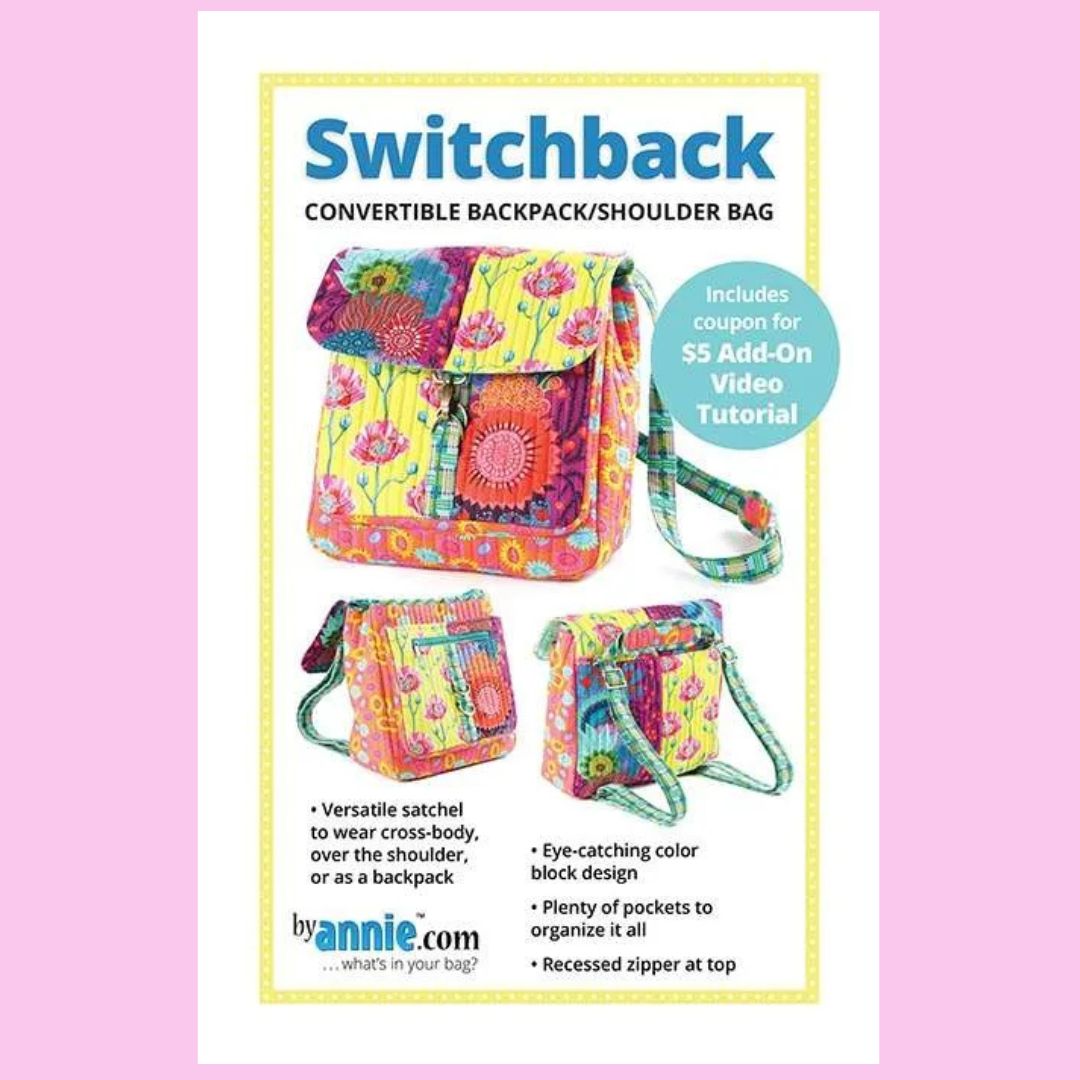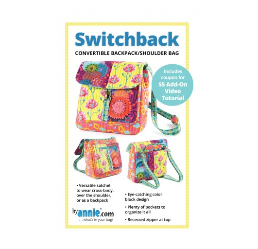 Switchback is designed to be made with a variety of fabrics, alternating them for a fun color-block style. The color-block design shows on both the front pocket and flap AND on the bag back.
