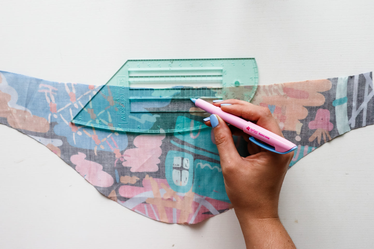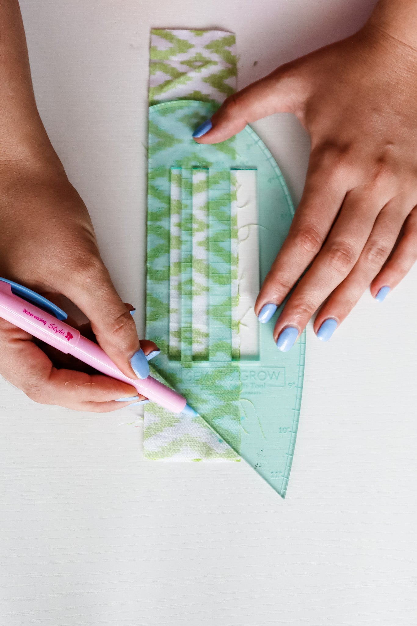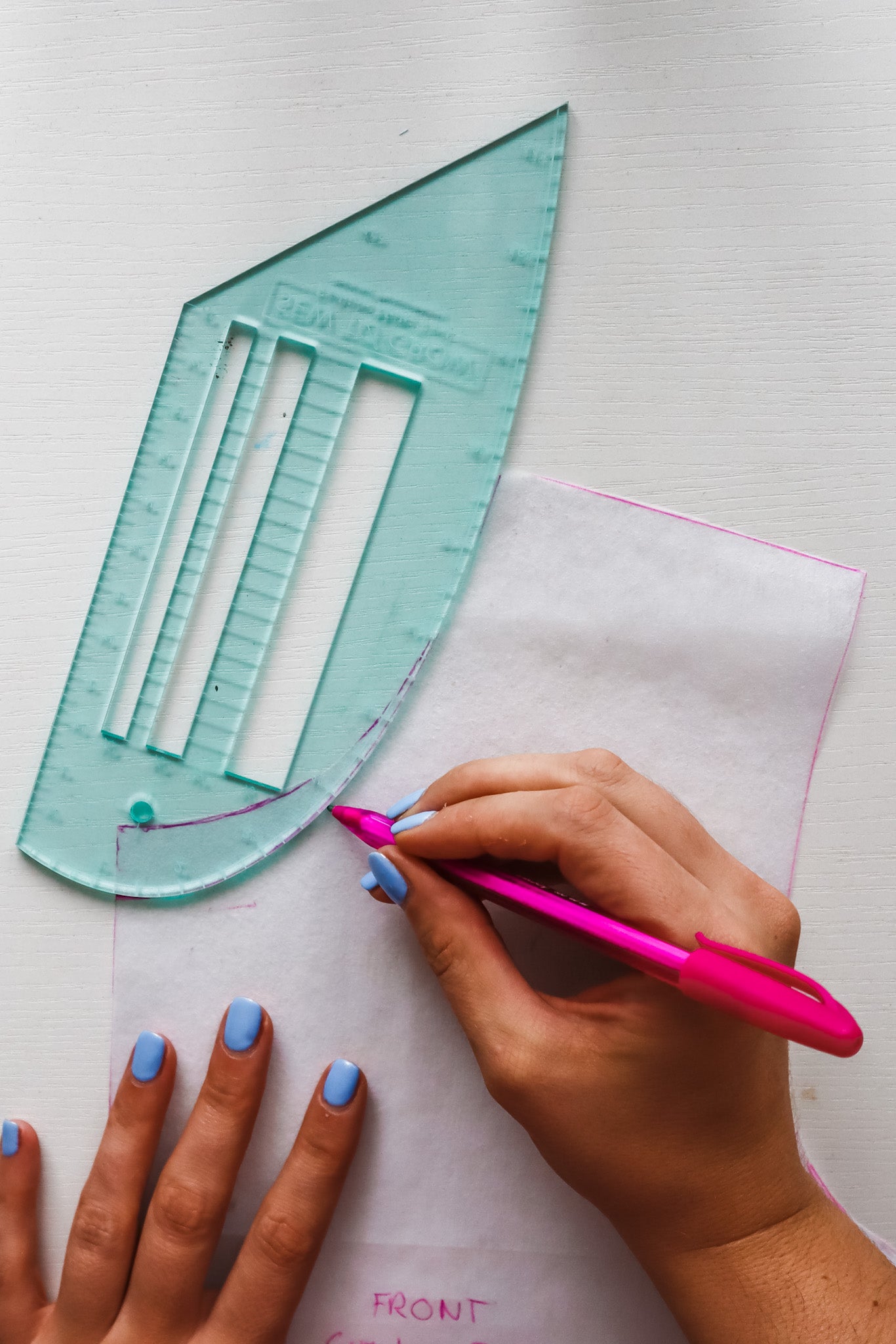 This tool features a French curve, seam gauge, point turner, mitering tool, hemmer and button hole placement.