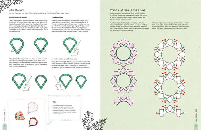 Alice's Country Diary Quilt is a breath taking fusion of English Paper Piecing (EPP), hand embroidery and quilting, inspired by the beauty of the countryside. Featuring 25 unique embroidery designs, this quilt showcases delicate wildflowers and insects, framed by luxurious Liberty Tana Lawn fabrics – though any quilting fabric can be used.